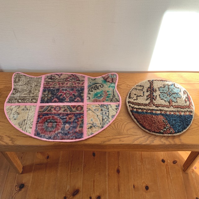 能登応援 チャリティねこラグセット 09 内容 ・ヴィンテージラグ 猫型ラグ ❀サイズ:約35cm×50cm ❀素材:オーガニックウール ❀産地:トルコ ・ヴィンテージラグ ミニ丸ラグ ❀サイズ:直径約30cm ❀素材:オーガニックウール ❀産地:トルコ ※売上の一部を被災地支援のために寄付させていただきます。 ・・・・・・・・・・・・・・・・・・・・・・・・・・・・・・ ※当店のパッチワークラグは、全て何十年もの間に渡って大切に使用されてきたヴィンテージラグを切り取り、手仕事で繋ぎ合わせて作られております。 色あせ、糸のほつれ、摩耗した部分、またはその補修箇所がある場合があります。 ヴィンテージや手仕事の特徴としてご理解いただける方のみのご購入をお願いしております。 ※トルコの専門店で専門的にクリーニングされているため、すぐに使用していただけます。 ※日々のお手入れは、表裏とも掃除機をかけてください。(ブラシ不使用) 汚れた場合は、絞った雑巾で拭き掃除できます。 また、手洗い、洗濯機の手洗いモードで洗っていただけます。 ※羊毛を使用しているため、独特な匂いがする場合があります。ご使用と共に軽減されますが、気になる場合は風通しの良い場所で干していただきますと軽減されます。