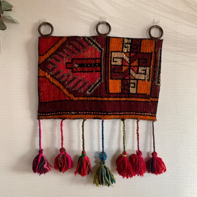 オレンジや赤色が元気で明るい気持ちになれる1枚です。 たくさんのタッセルもとってもかわいいです。 タッセルの真ん中についたガラスビーズがおしゃれです♪ ❀サイズ:約29cm×44cm ❀素材:ヴィンテージ手織りキリムラグ ❀産地:トルコ アナトリア ・・・・・・・・・・・・・・・・・・・・・・・・・・・・・・ ※こちらのタペストリーは、何十年もの間に渡って大切に使用されてきたキリムグを切り取り、作られております。 色あせ、糸のほつれ、摩耗した部分、またはその補修箇所がある場合があるかのうせいがあります。ヴィンテージや手仕事の特徴としてご理解いただける方のみのご購入をお願いしております。