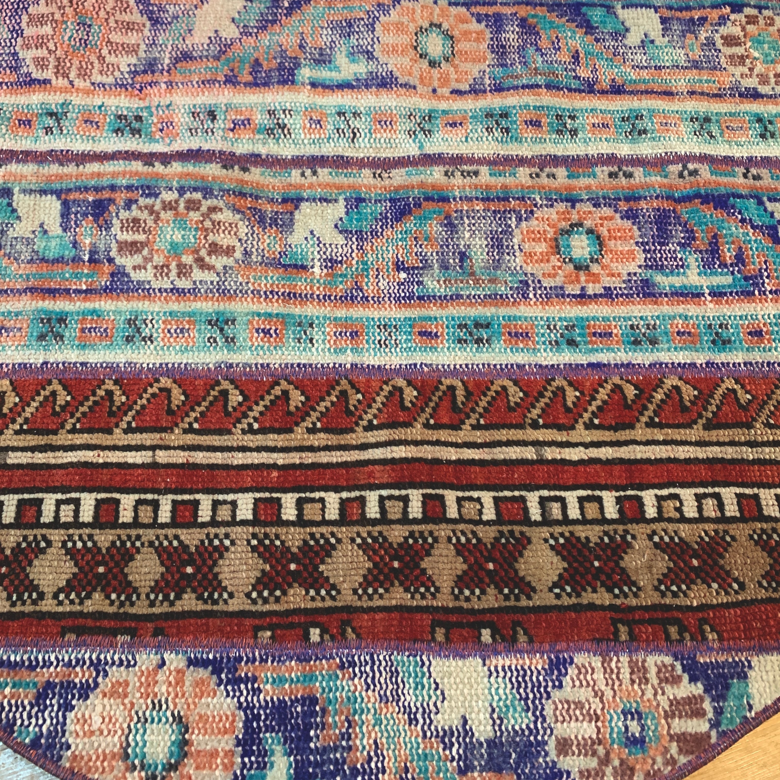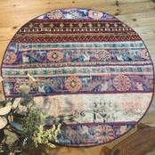 くすみネイビーとベージュ、ボルドーのラグがレトロで温かい雰囲気のラウンドパッチワークラグです。