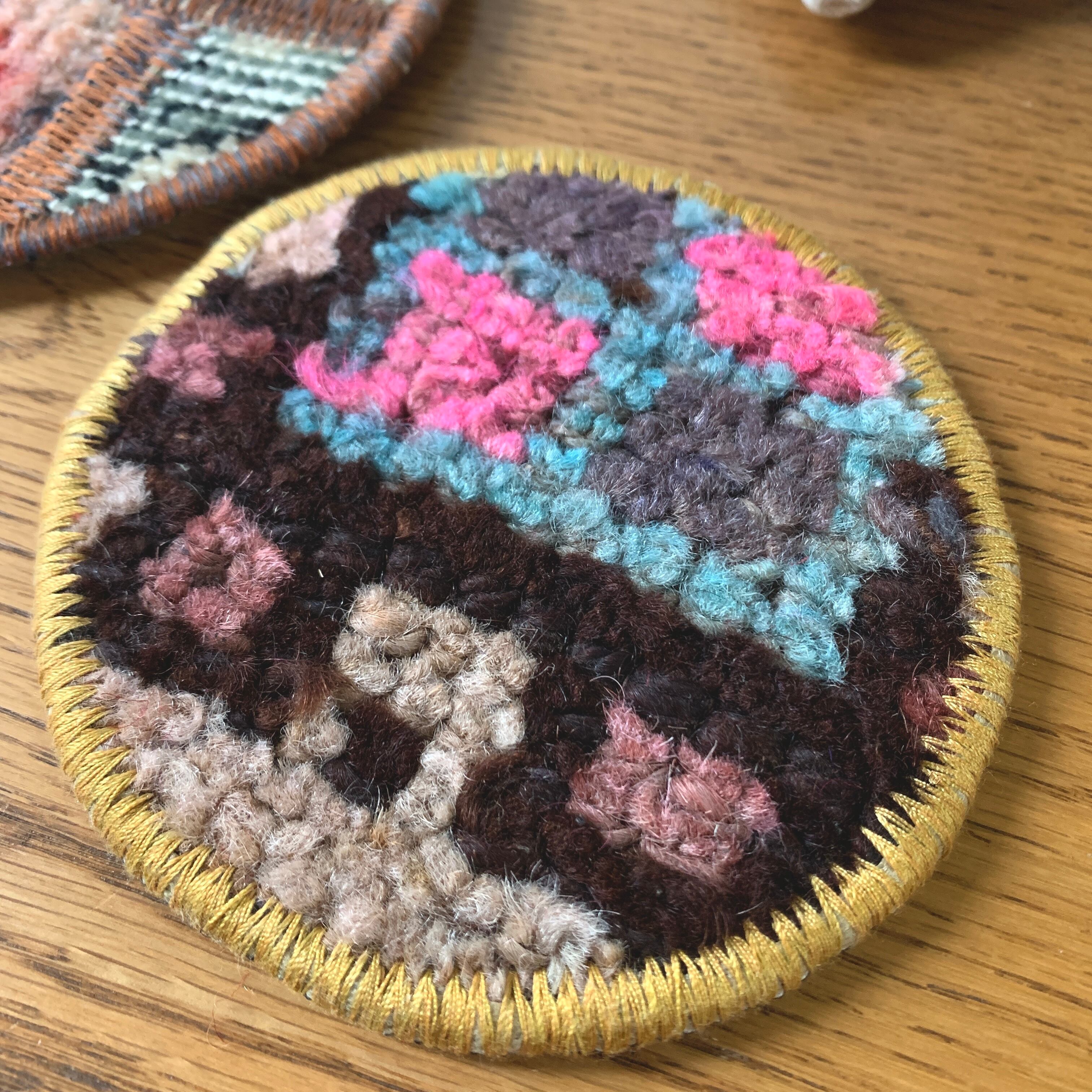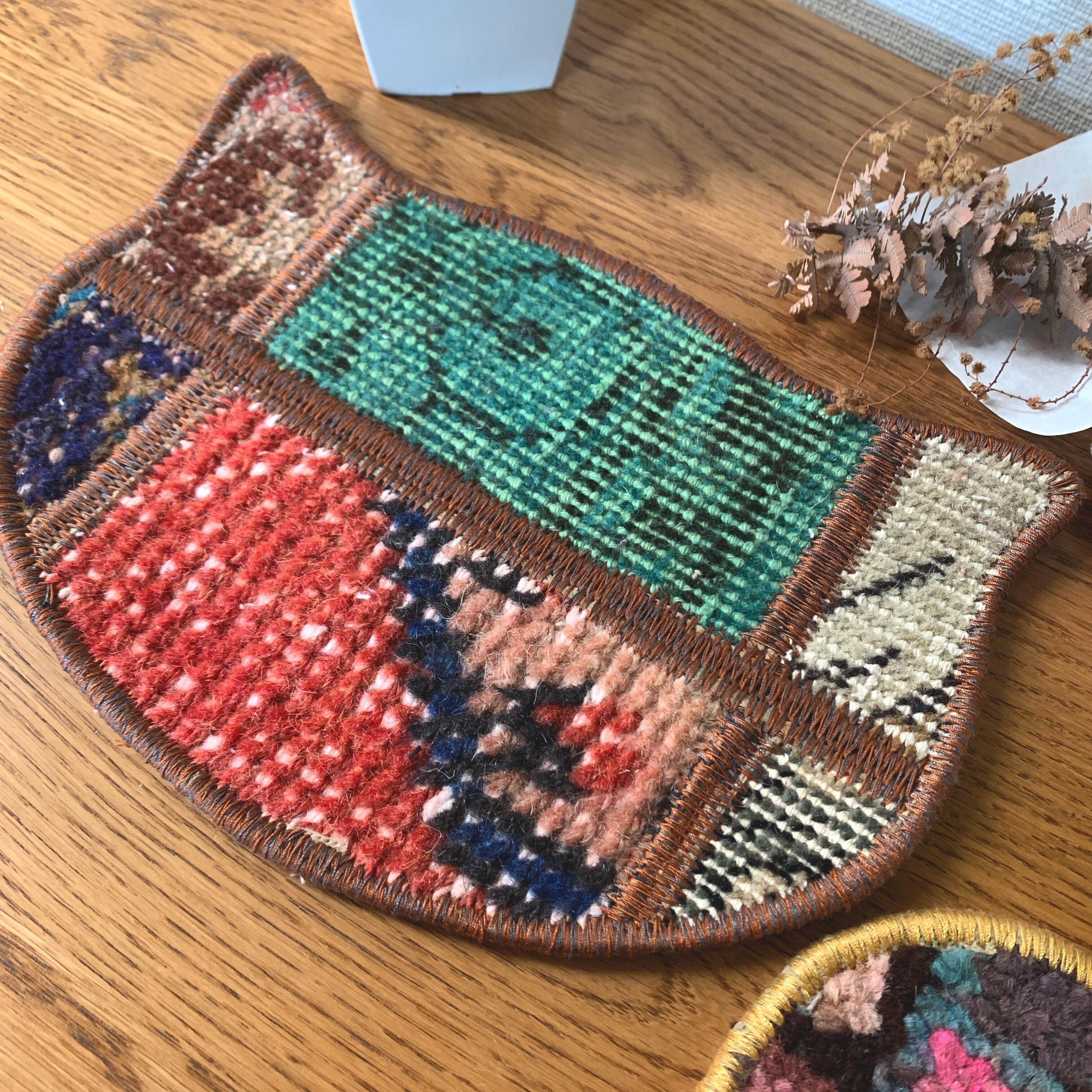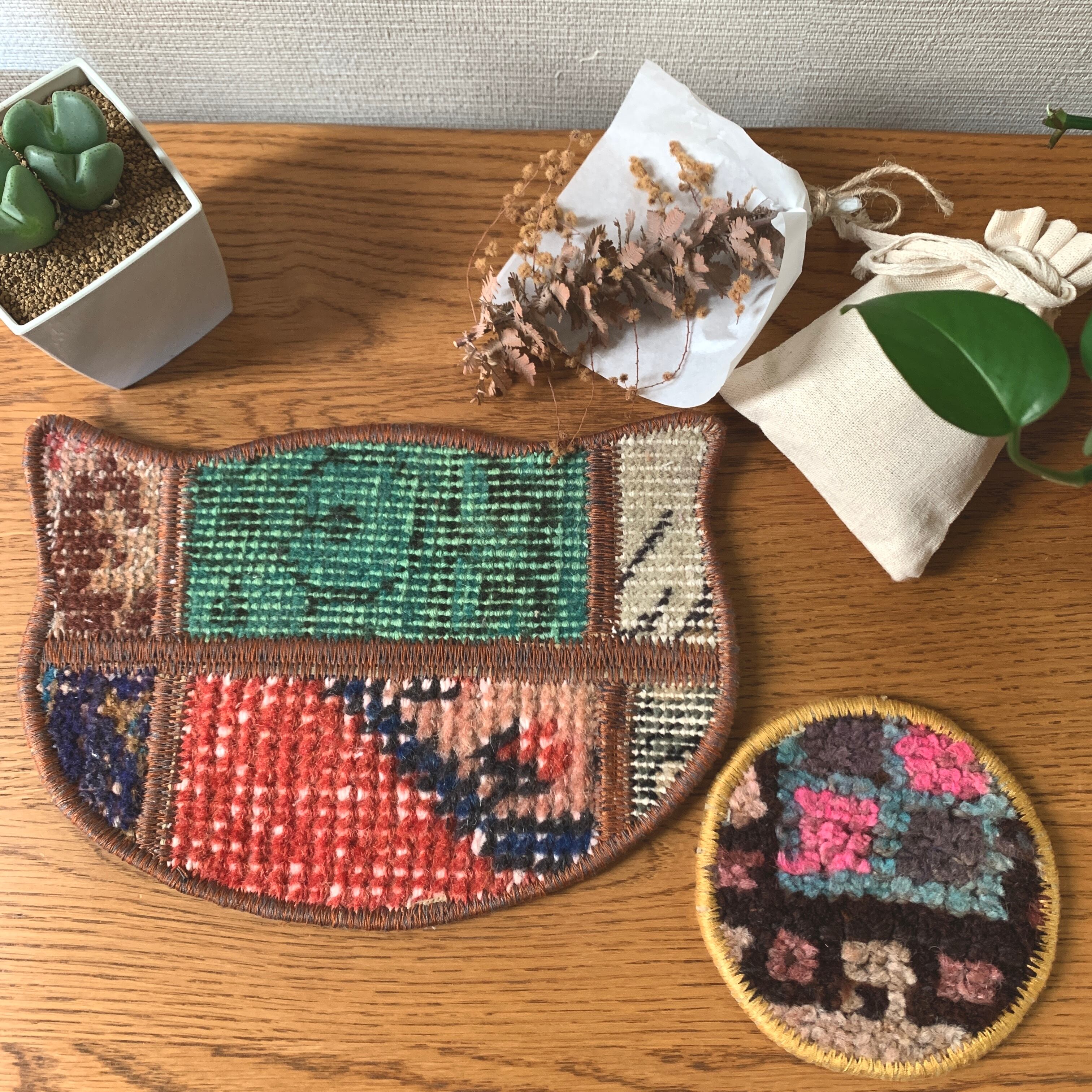 ちびねこちゃん、コースターともにヴィンテージラグから作られています。