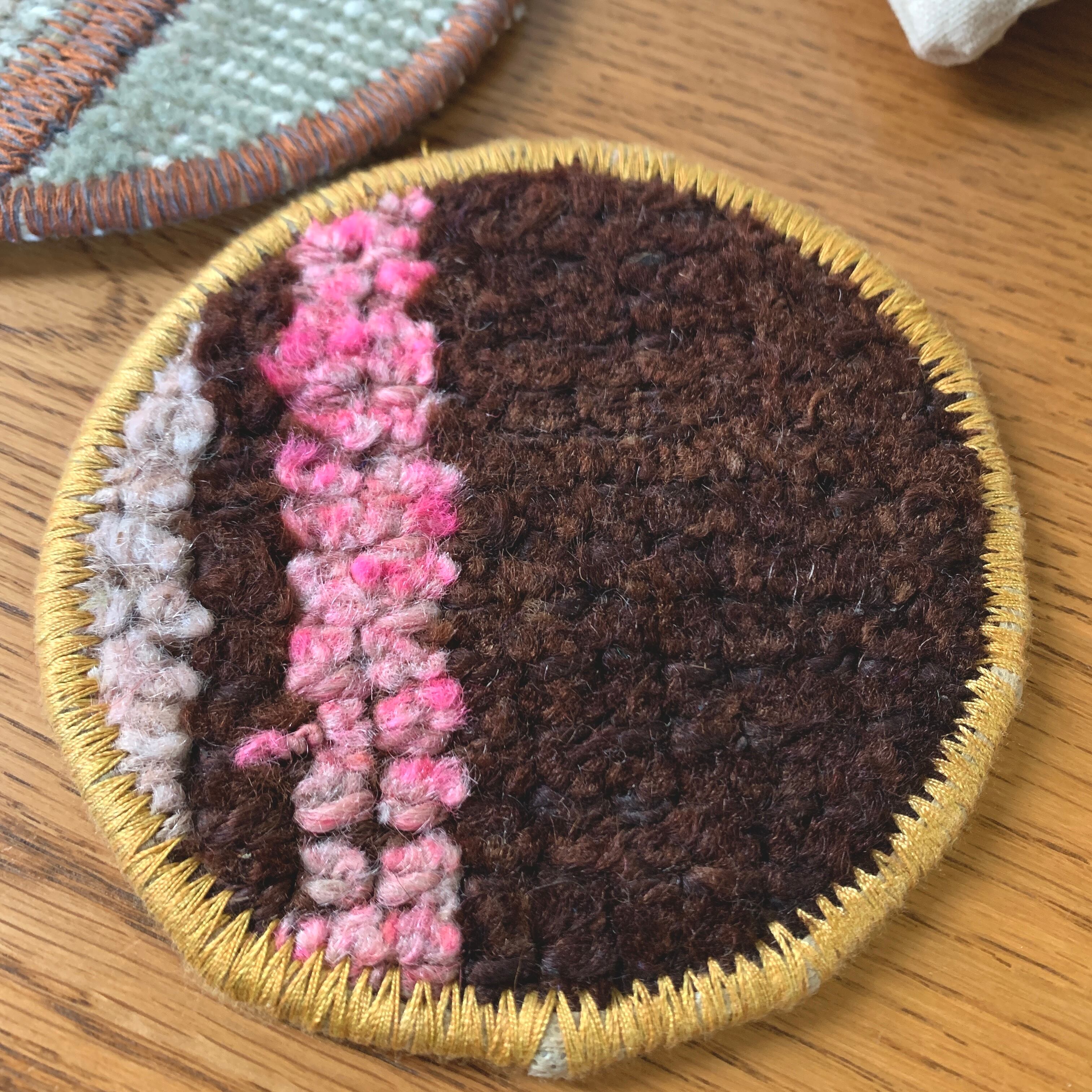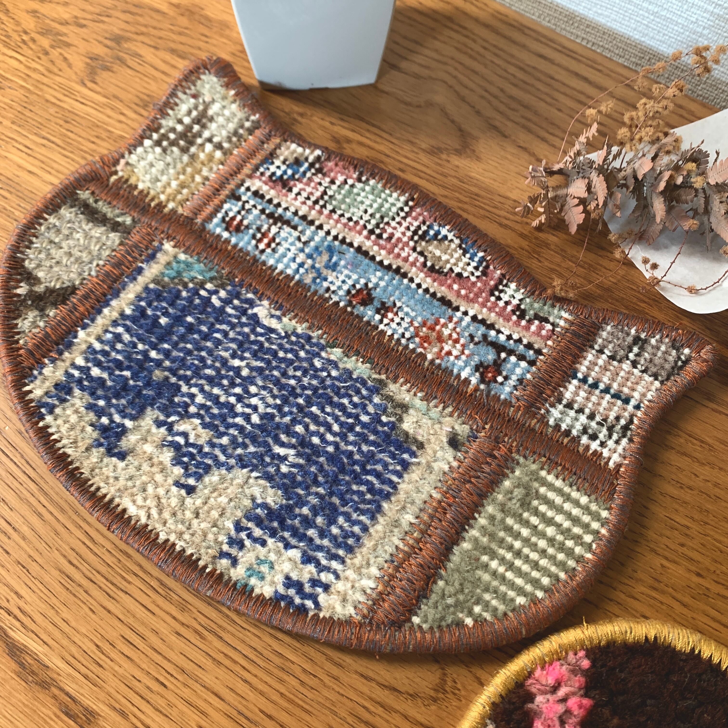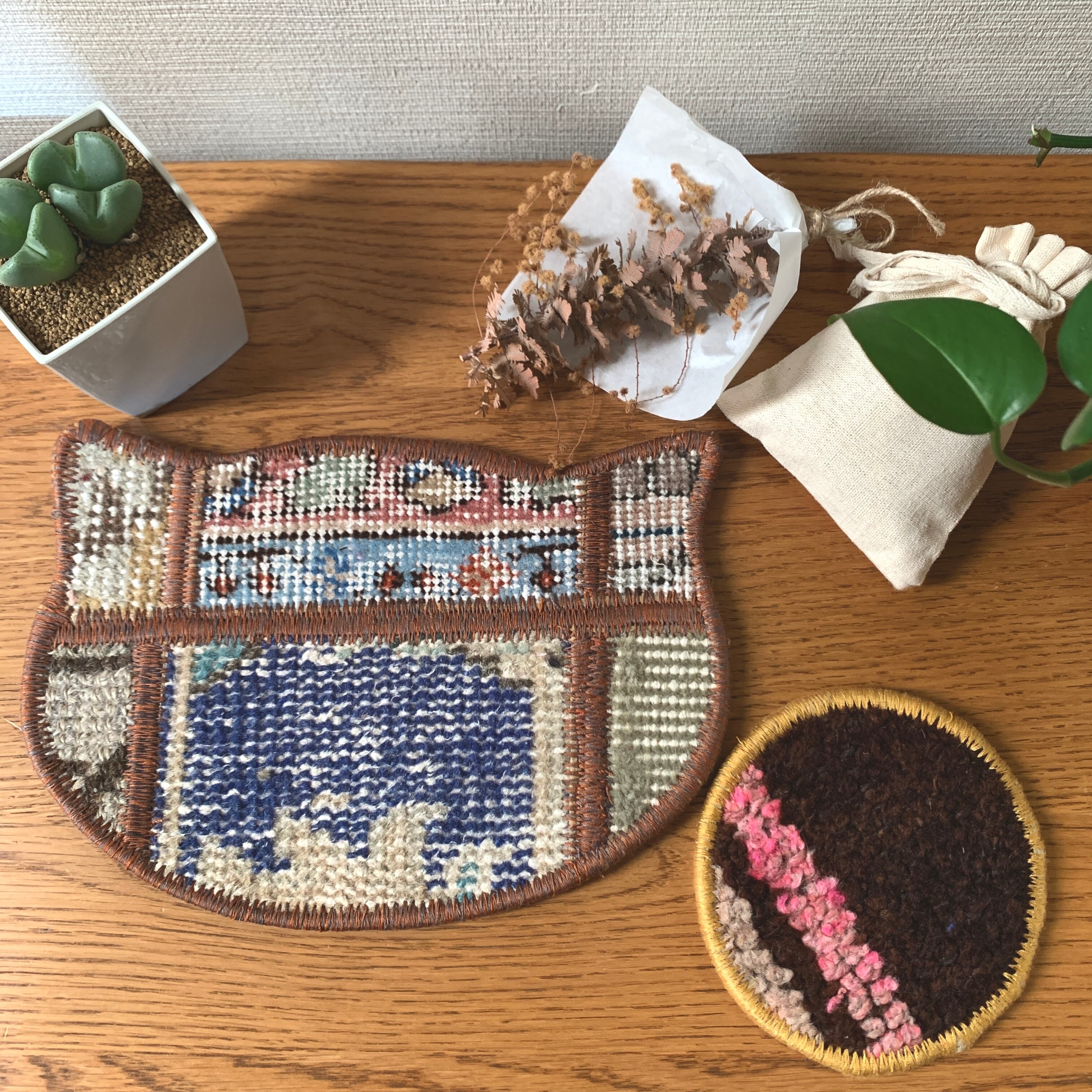 ちびねこちゃん、コースターともにヴィンテージラグから作られています。