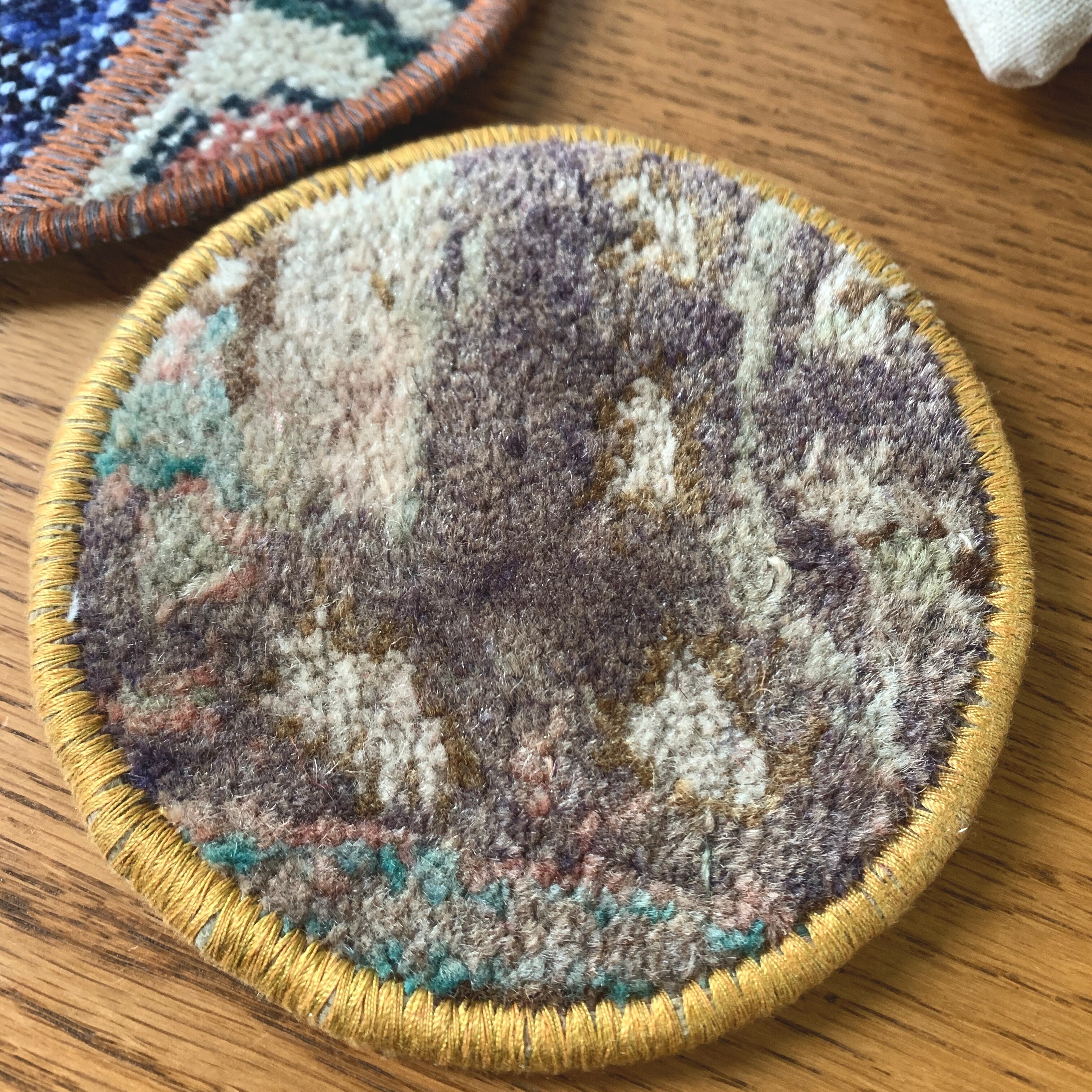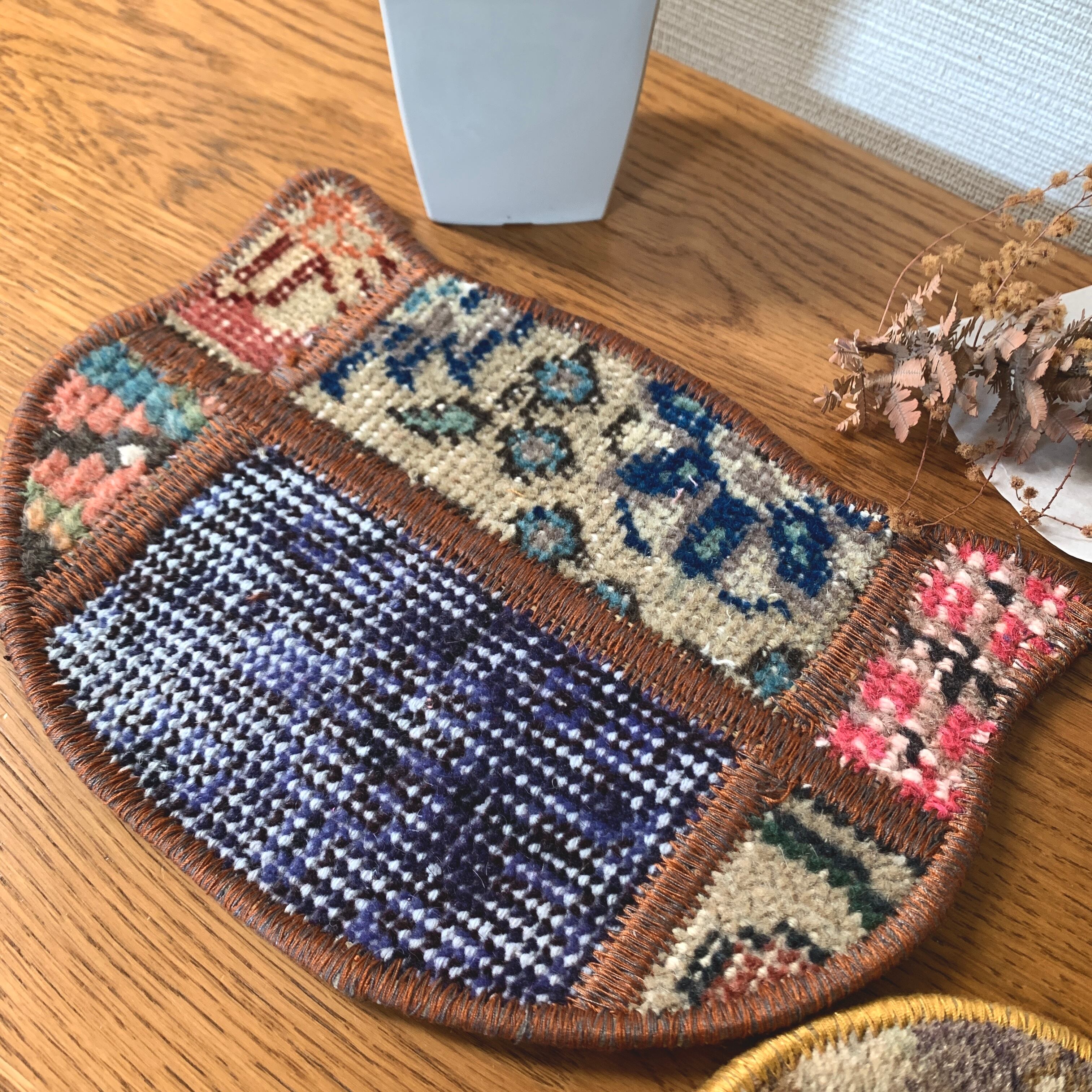 ちびねこちゃん、コースターともにヴィンテージラグから作られています。