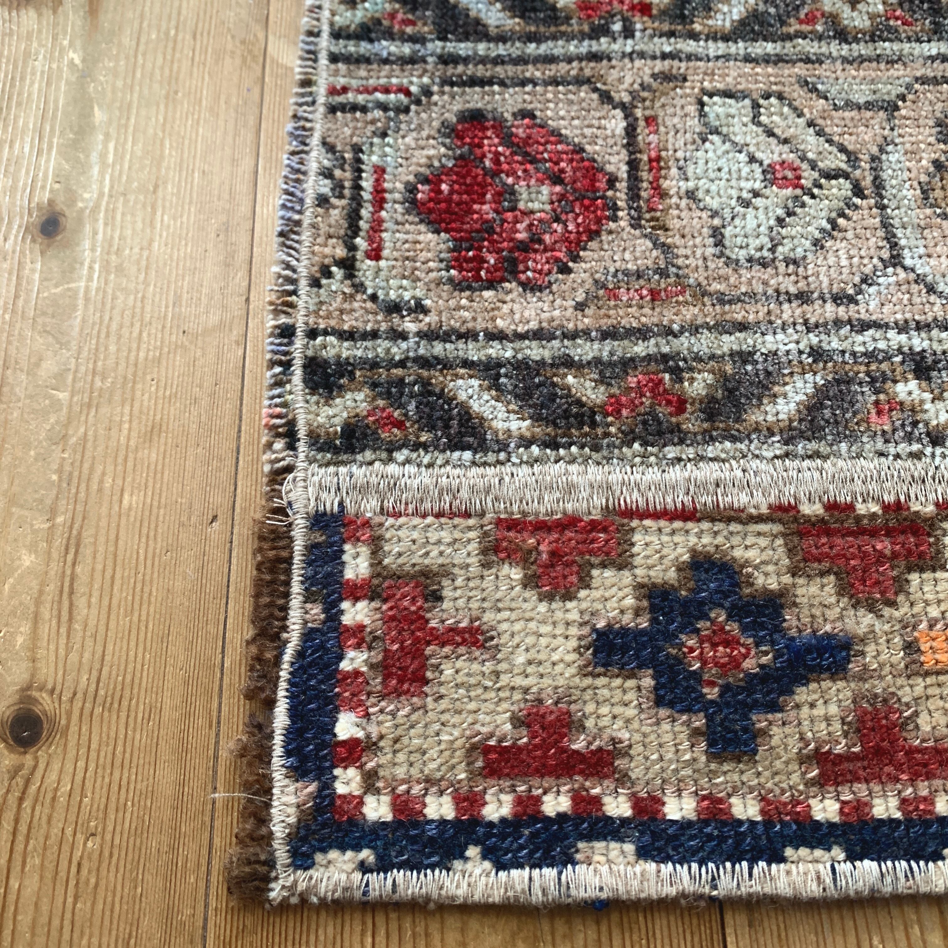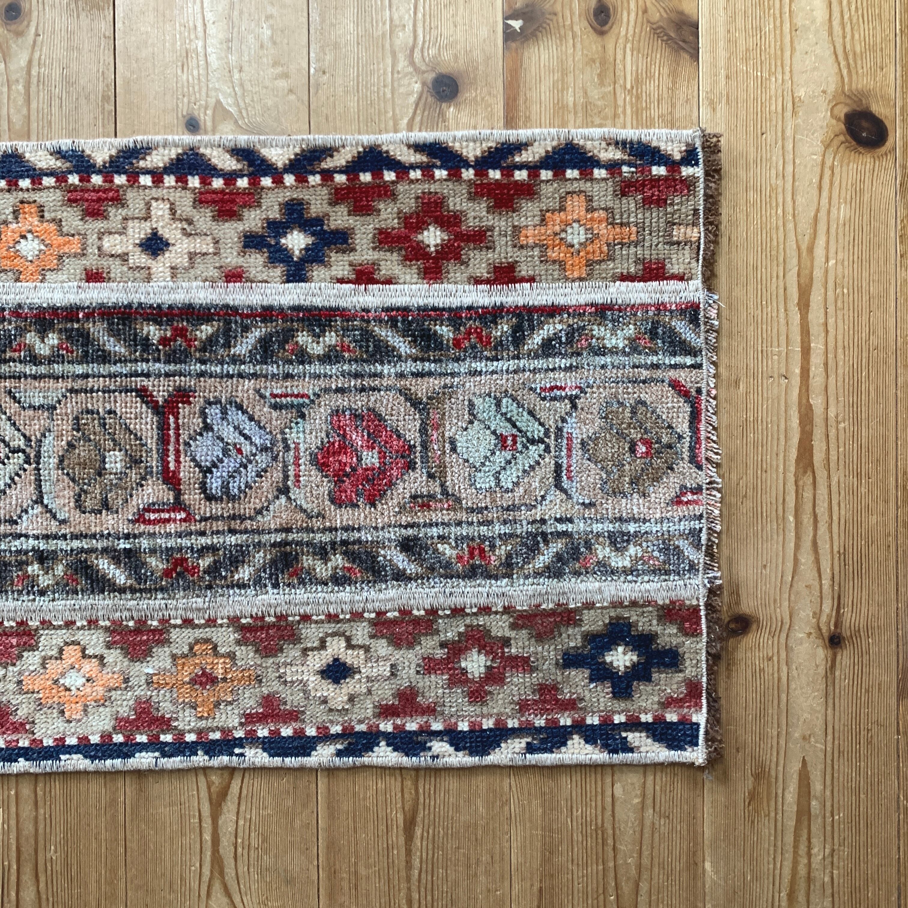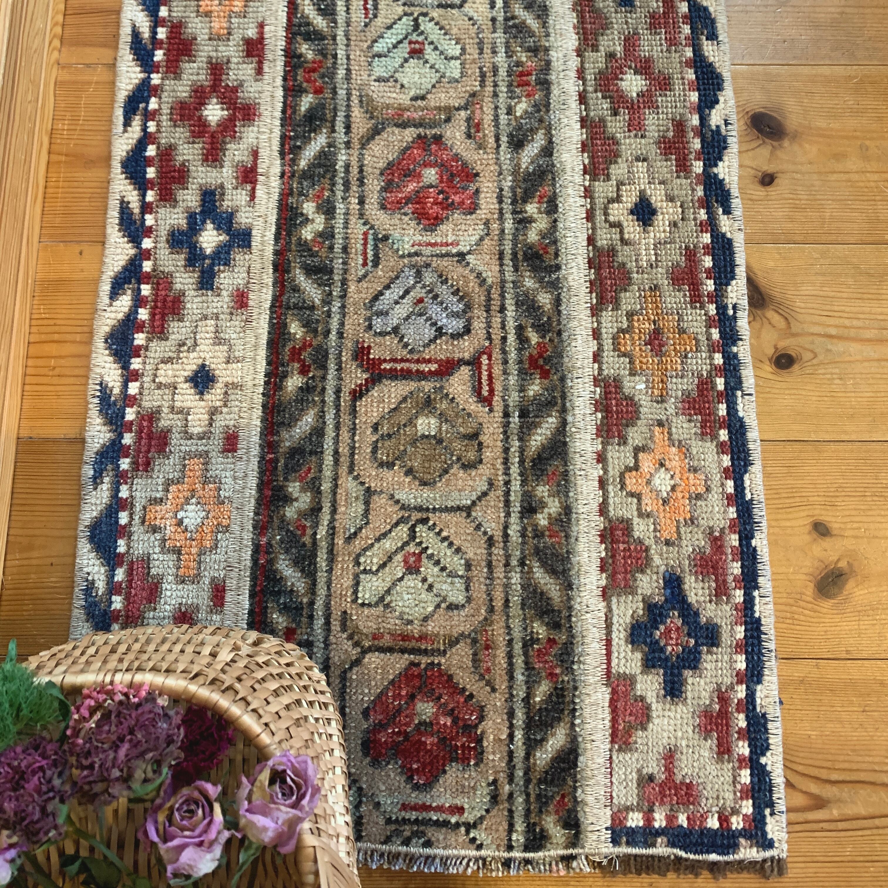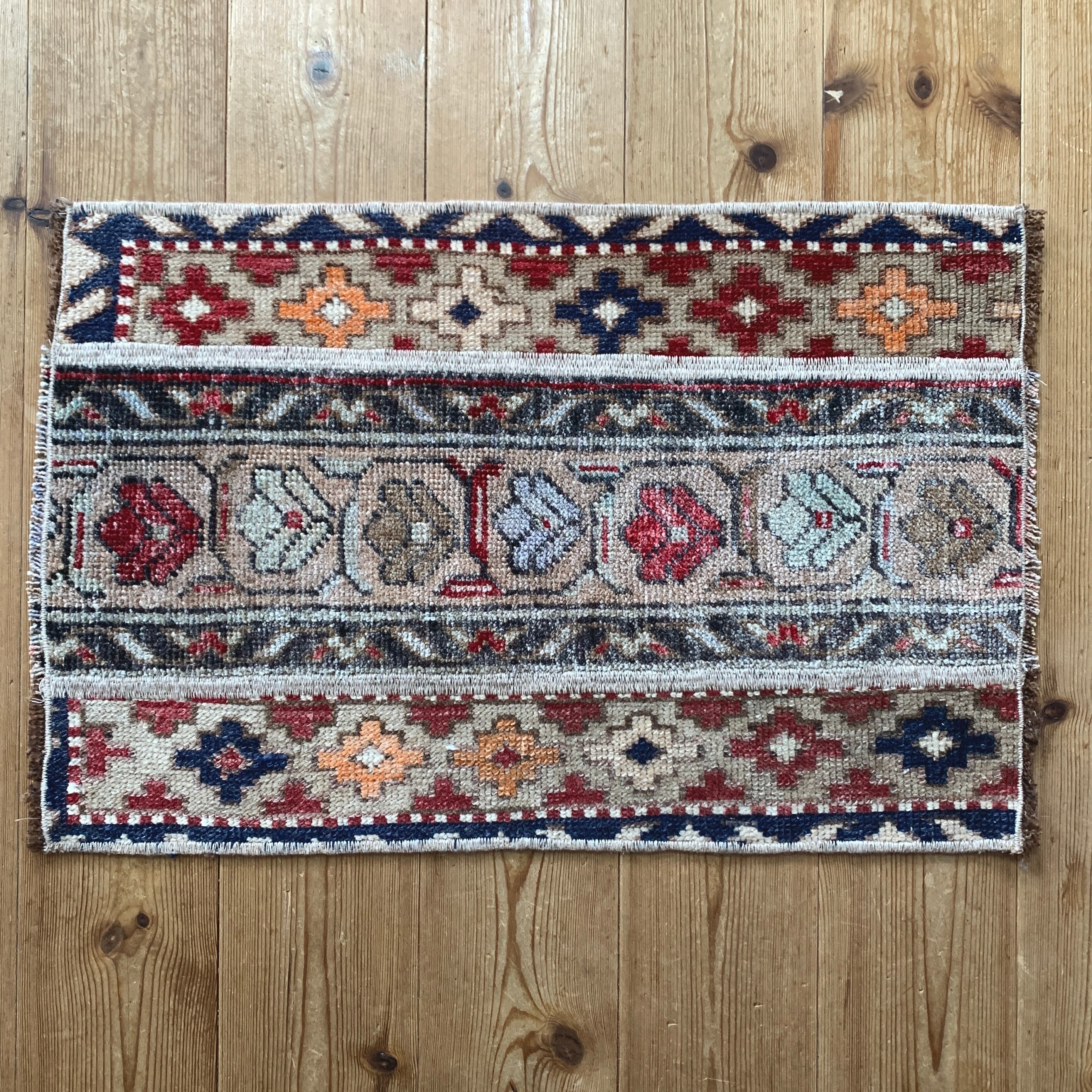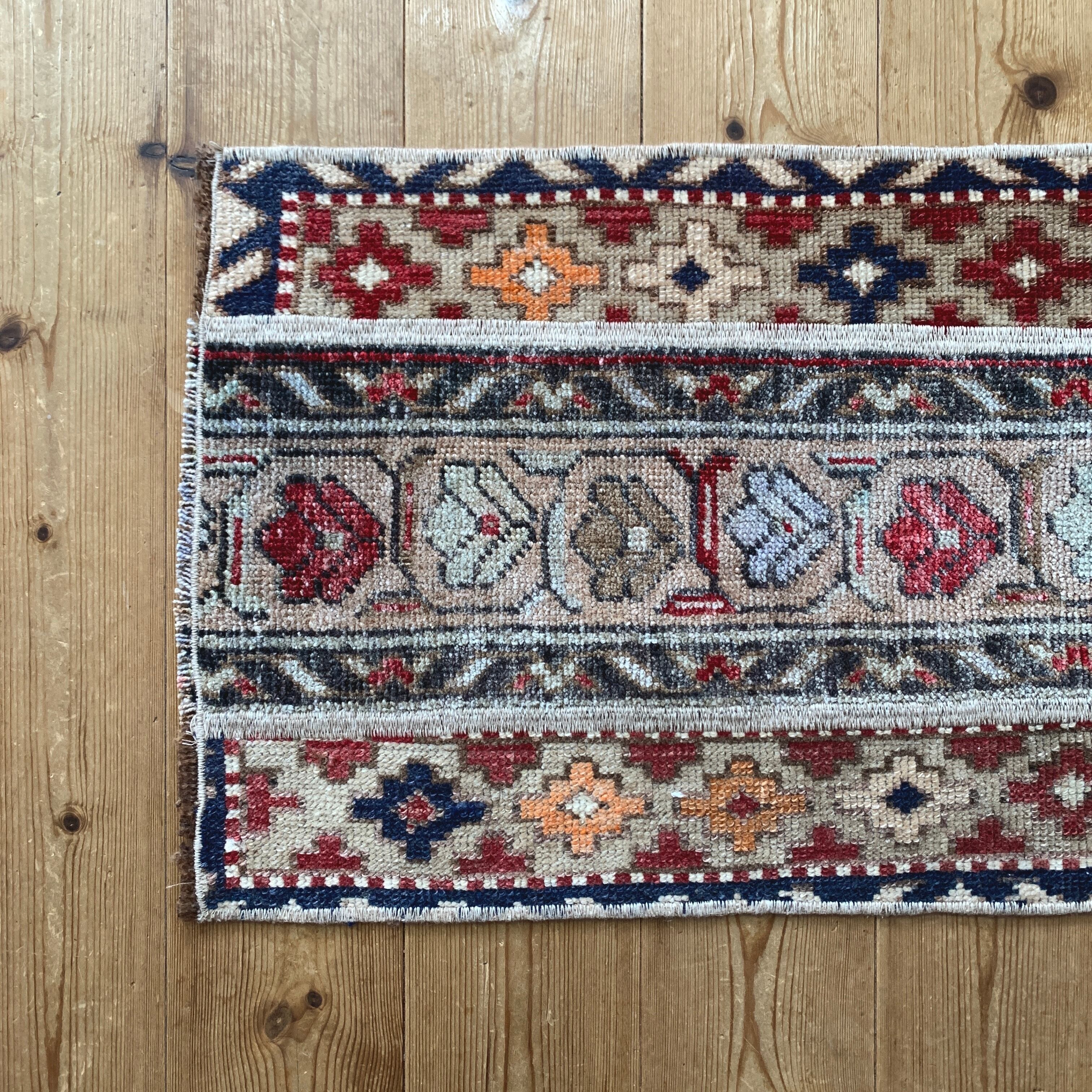 ベージュ、ネイビー、レッドにオレンジのカラーと花柄がかわいいパッチワークラグです。
