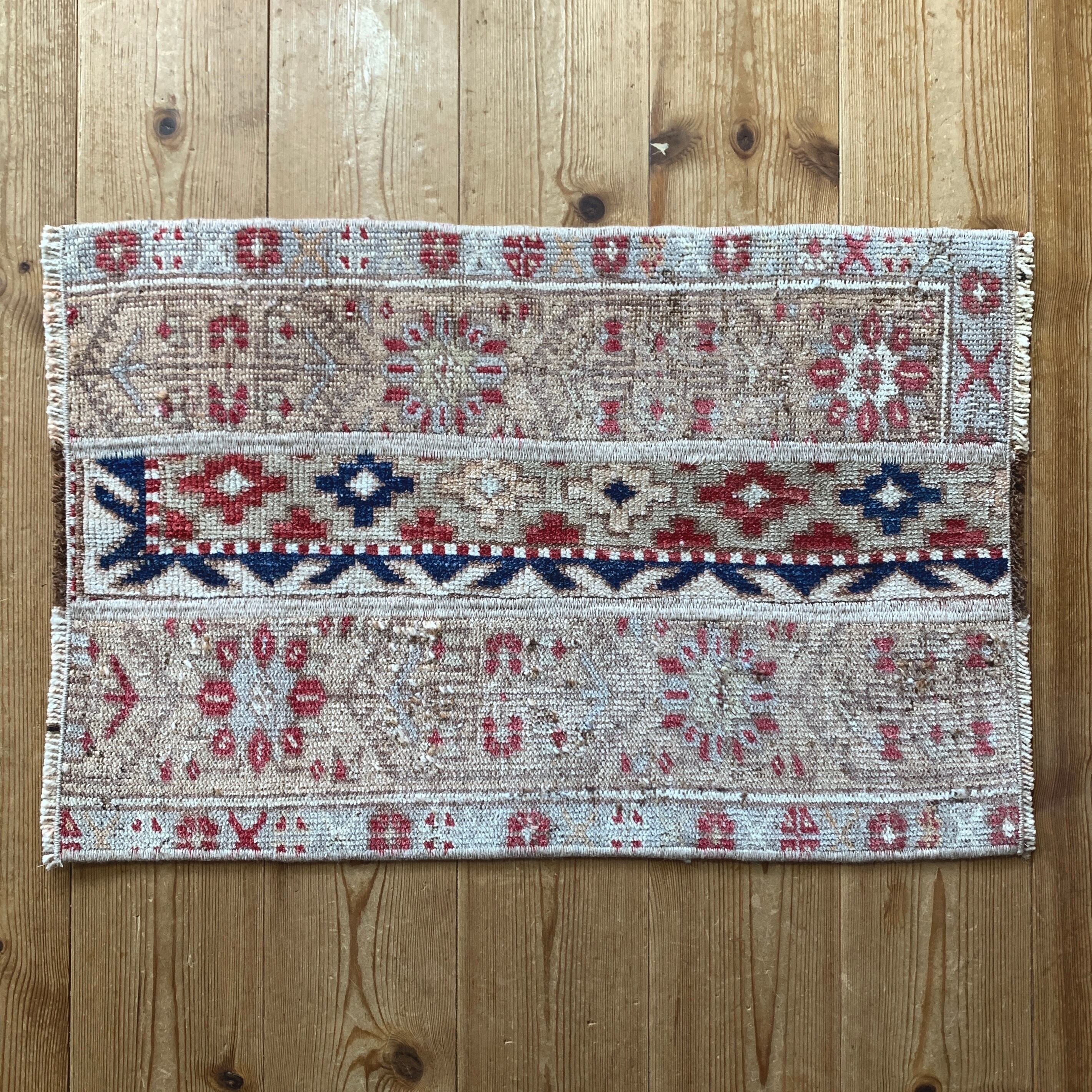 ベージュ、ネイビー、レッドのカラーとお花の織柄がかわいいパッチワークラグ。