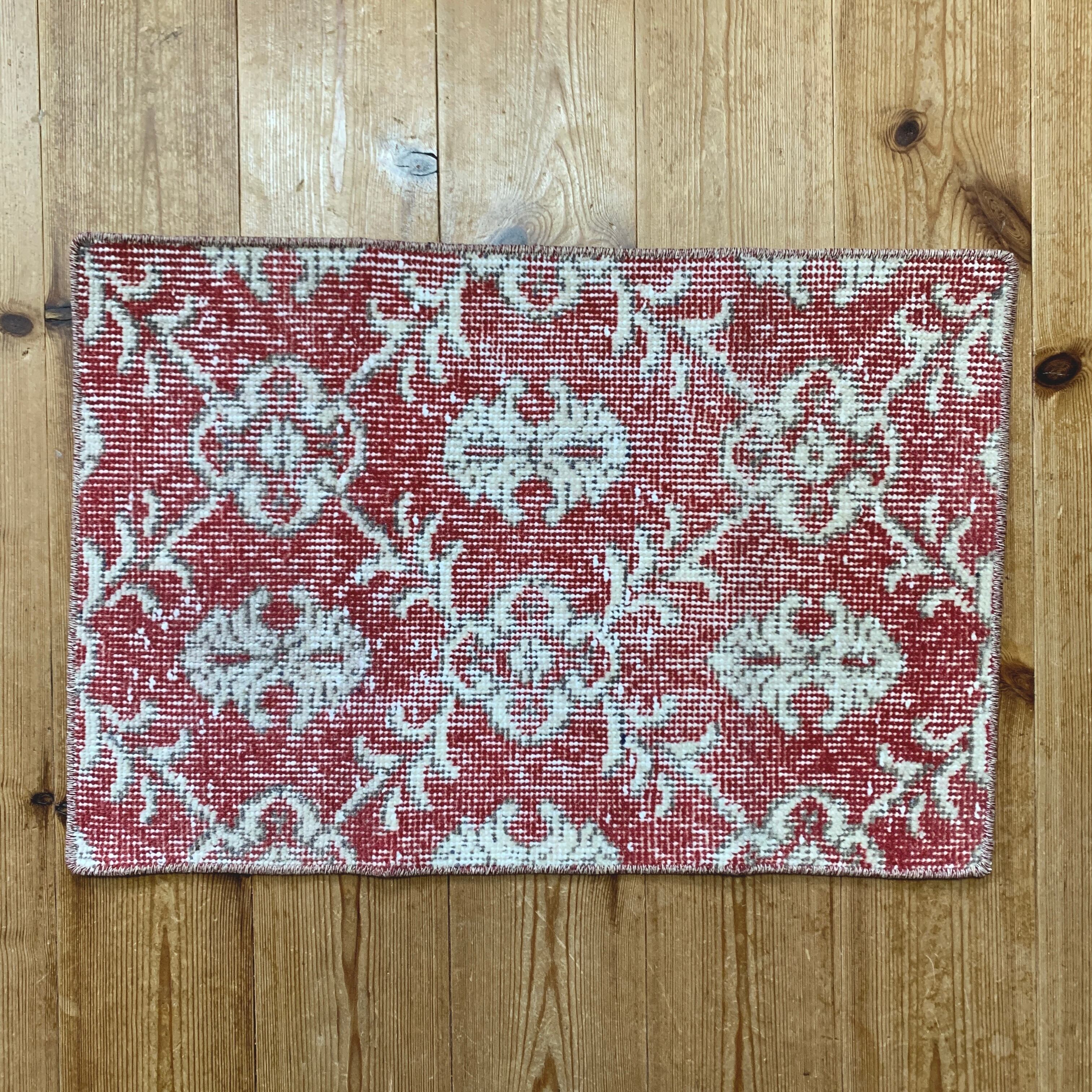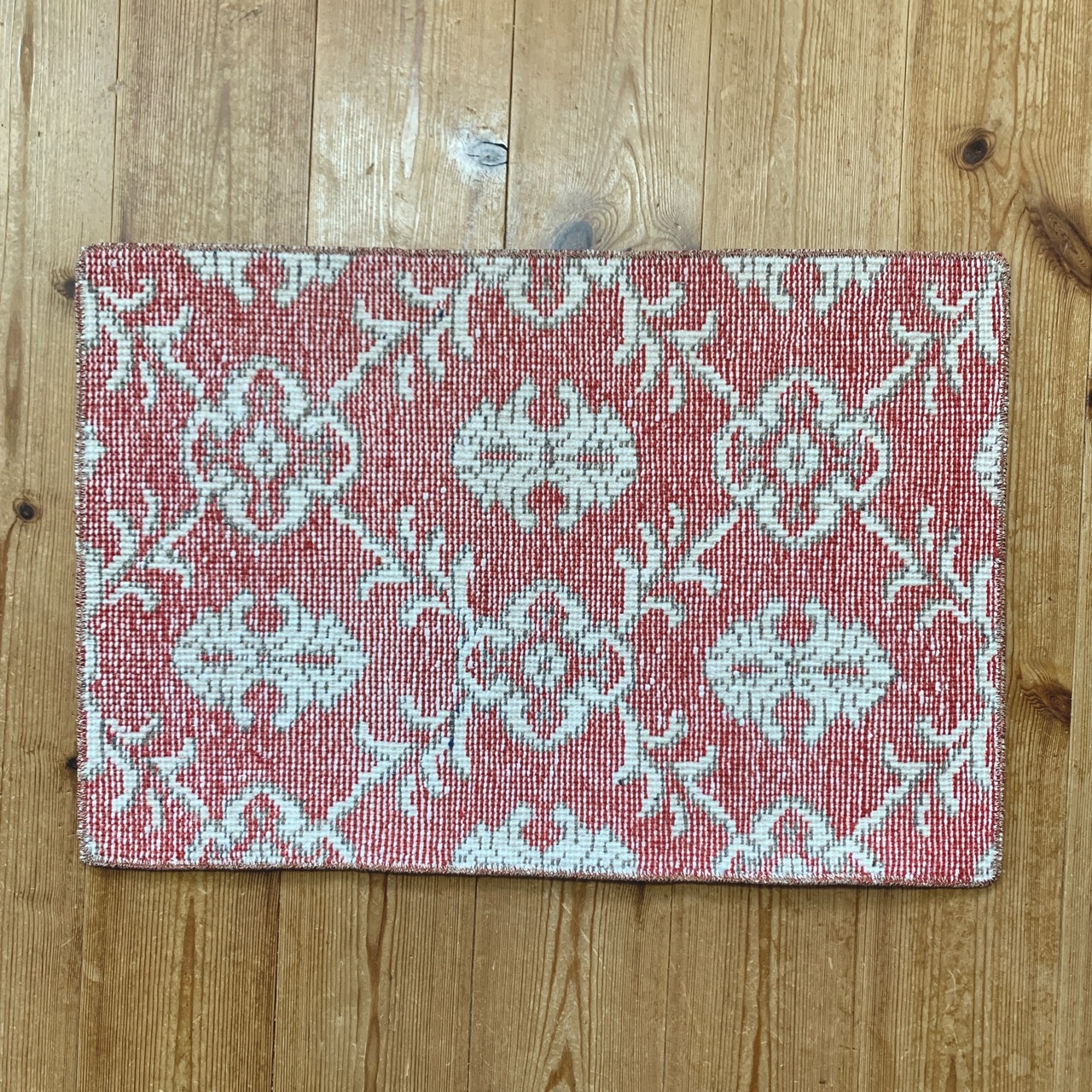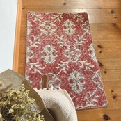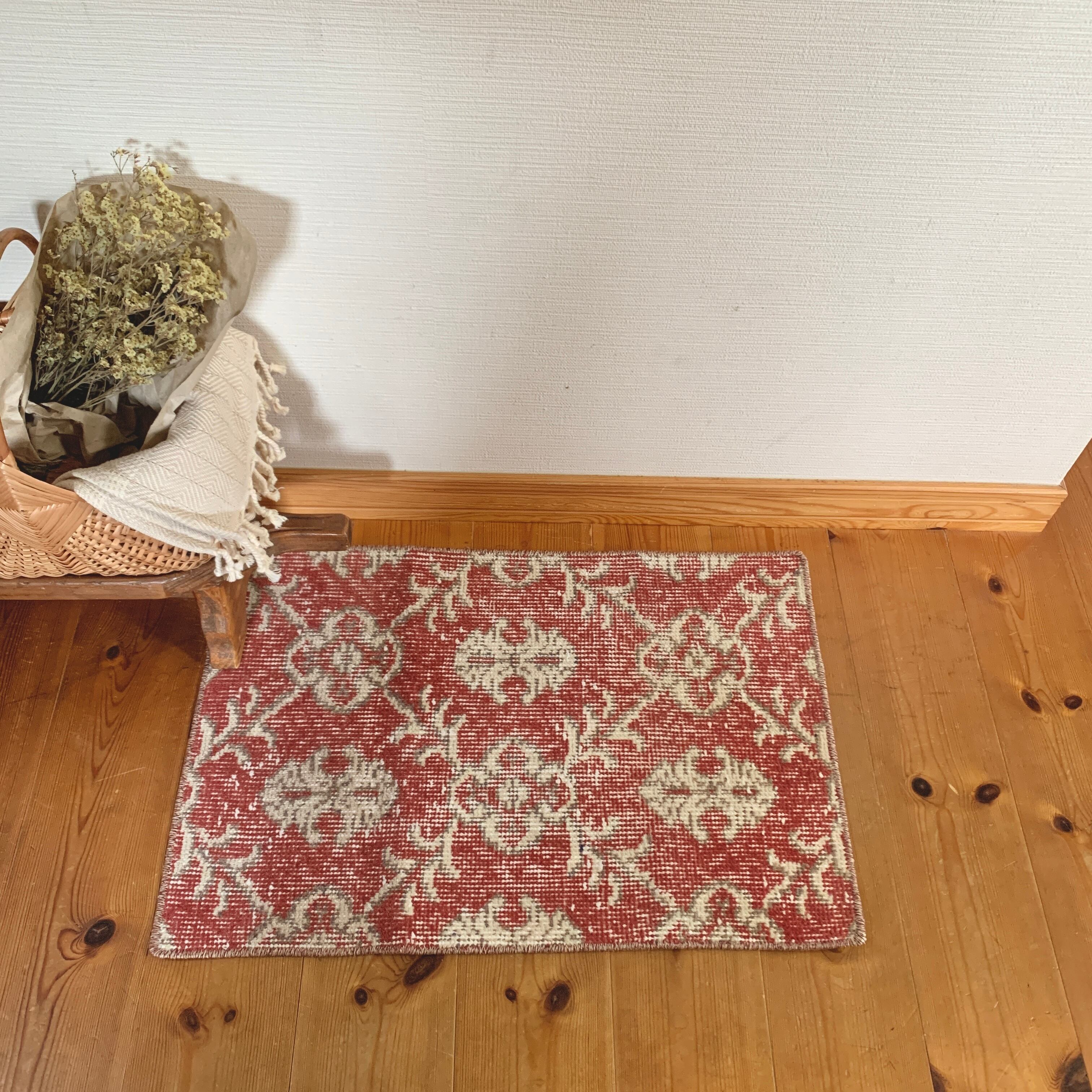 くすみレッドに白い紋章柄の小さめサイズのラグです。