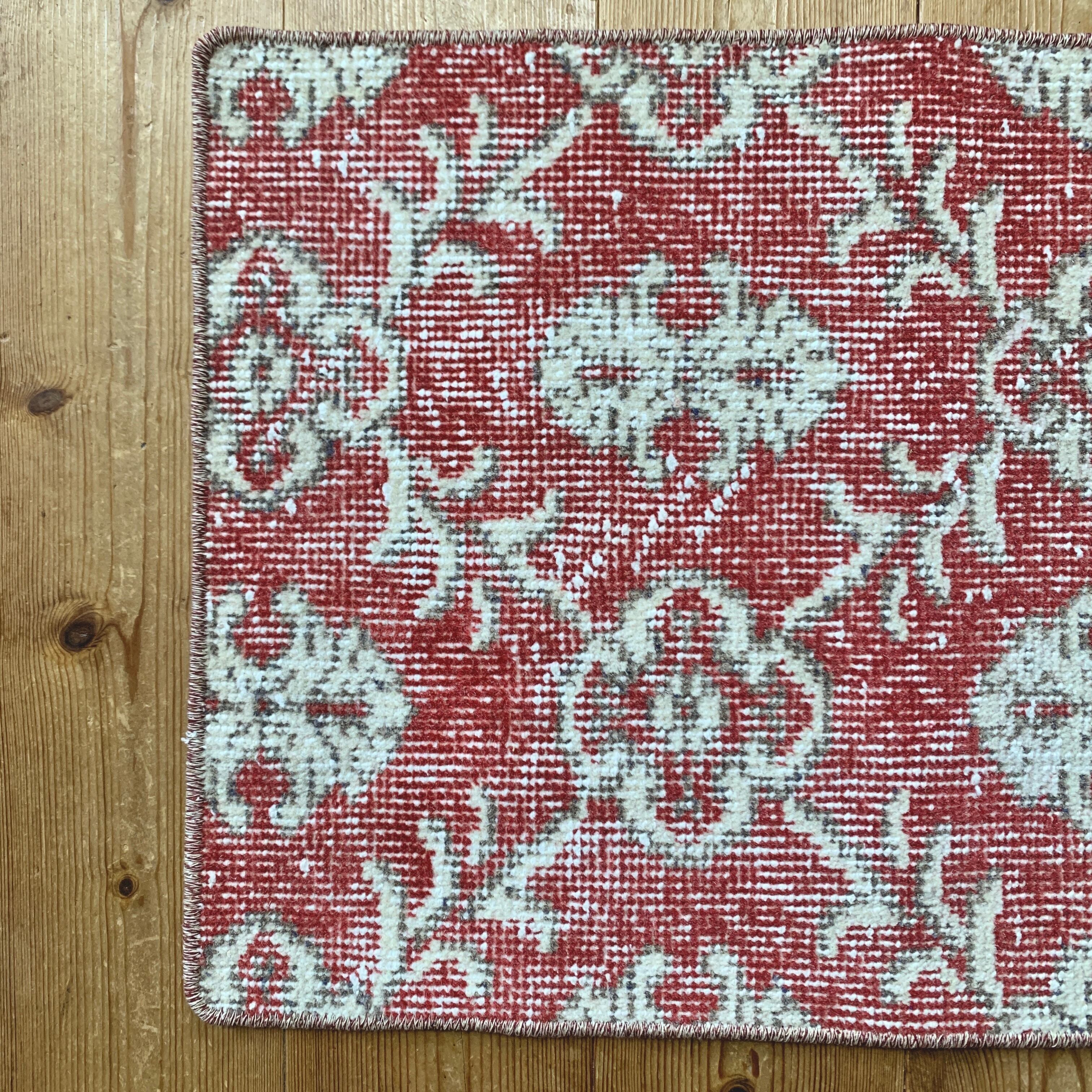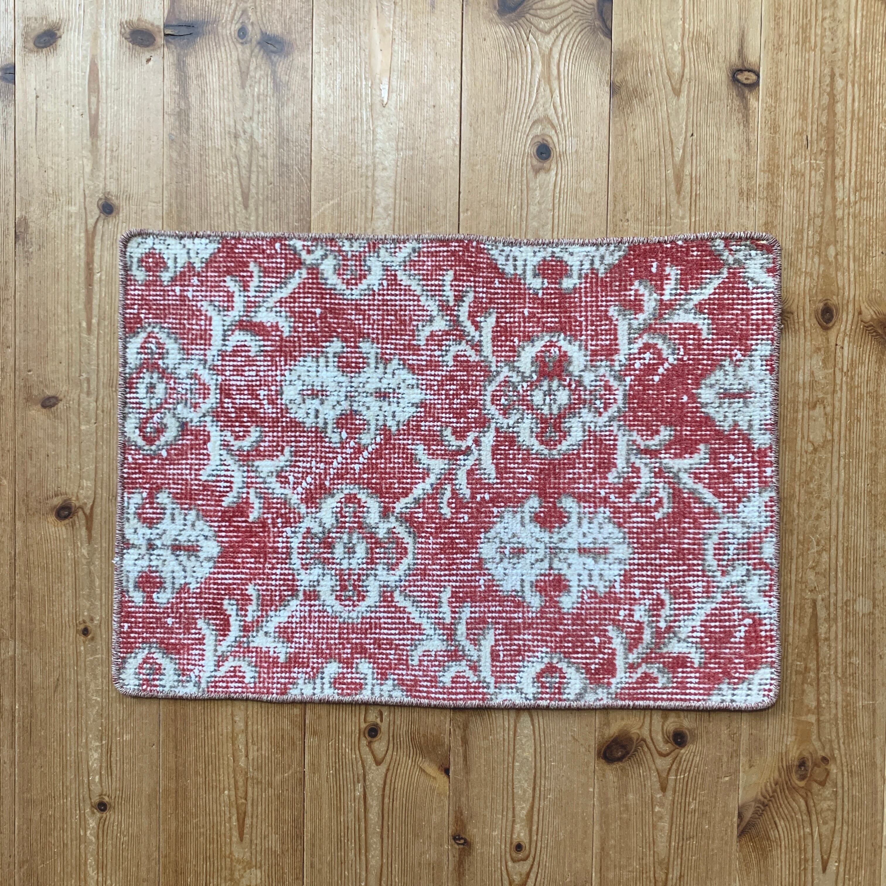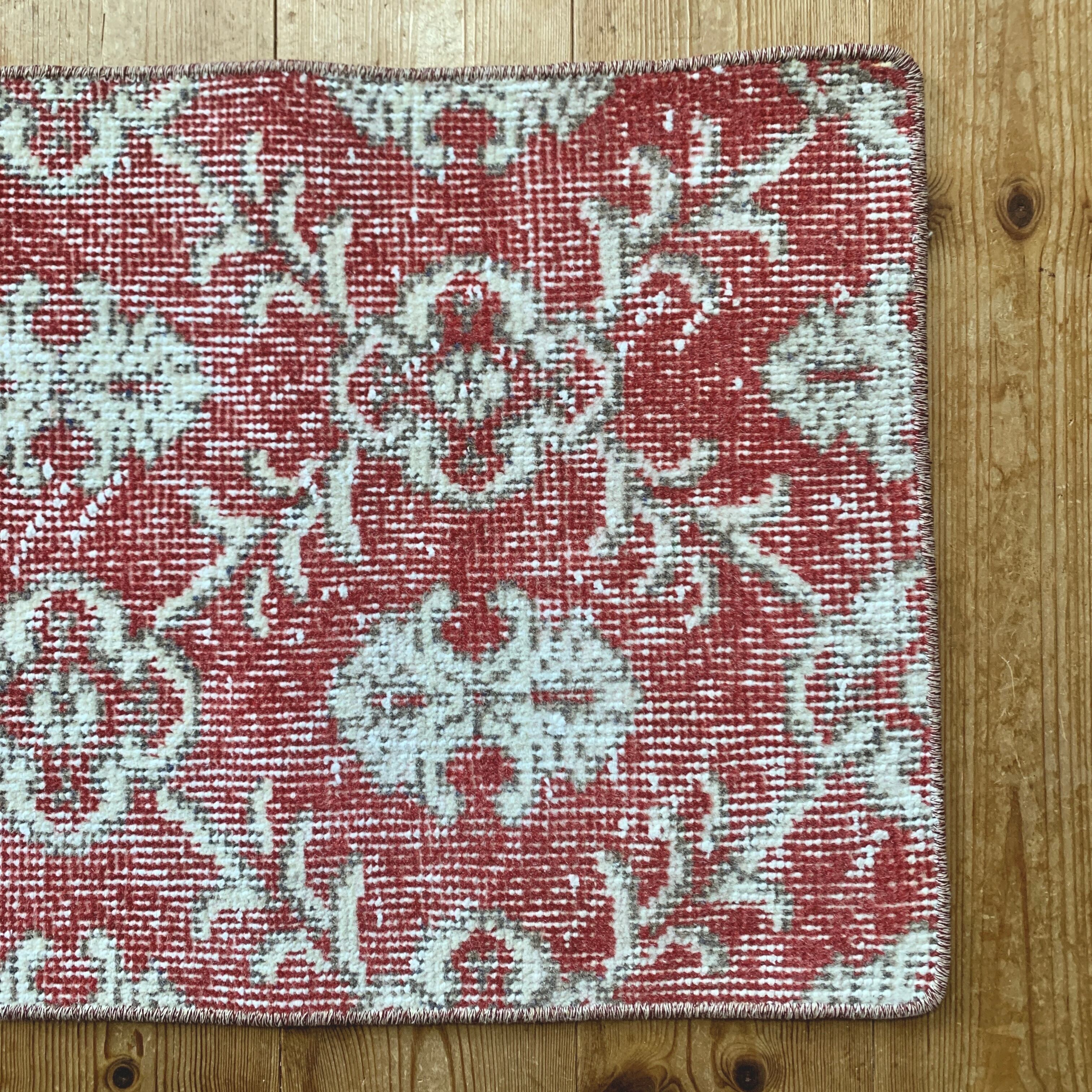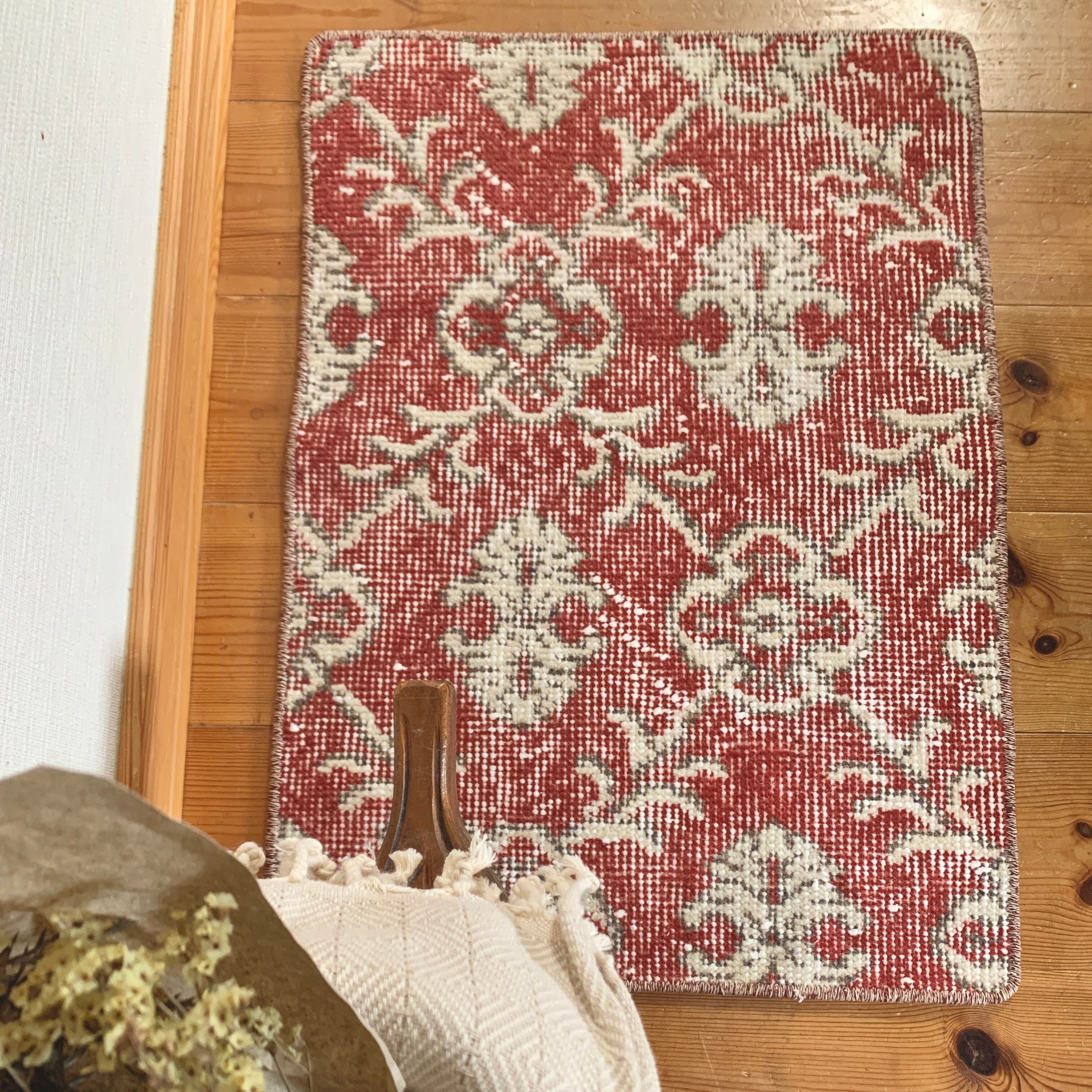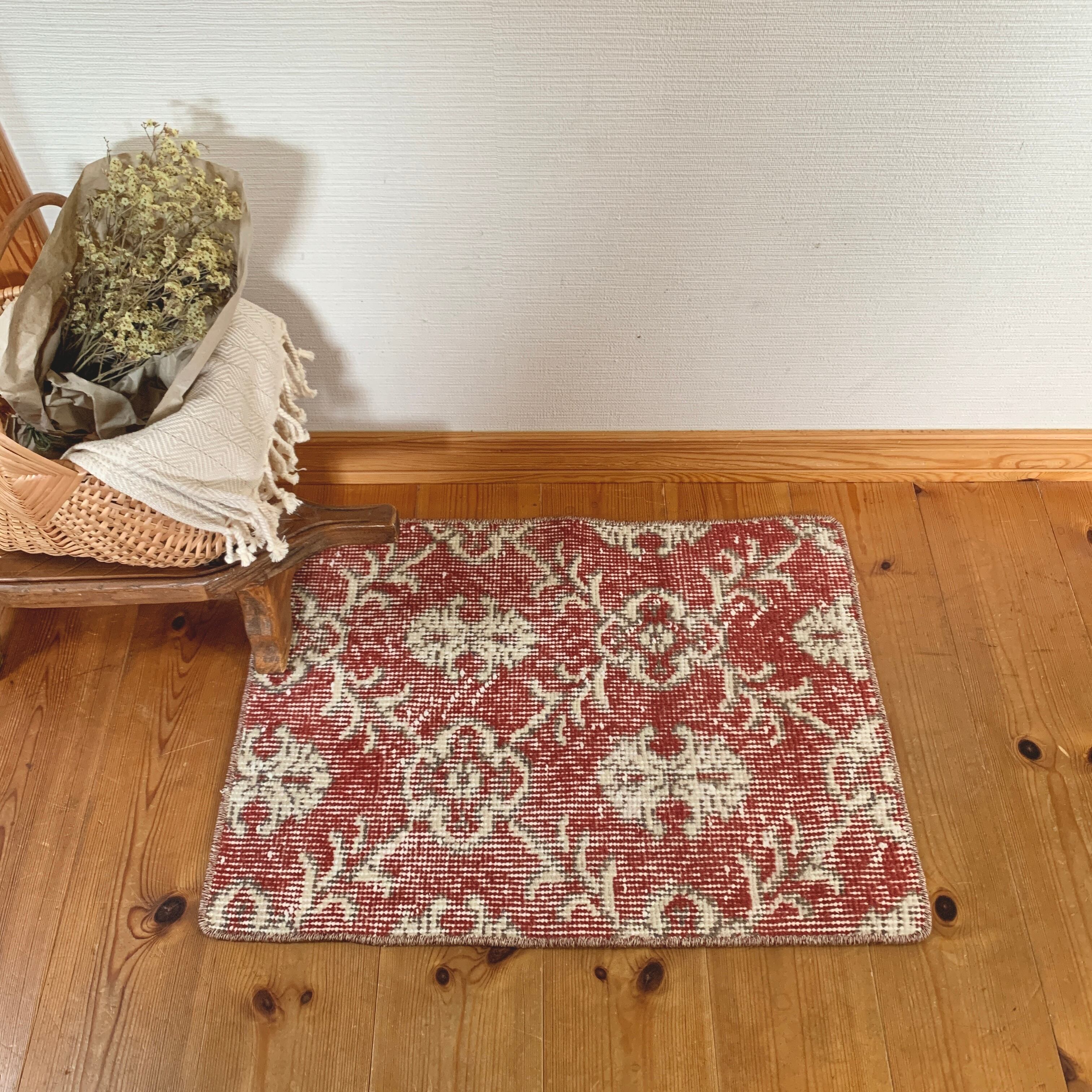 くすみレッドに白い紋章柄の小さめサイズのラグです。